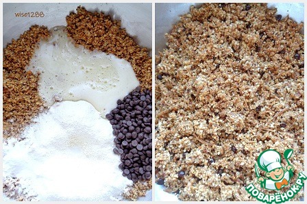 К арахису добавить муку, разрыхлитель, пищевую соду, шоколадные капли, яичную смесь. Перемешать. Тесто получится крупинками.