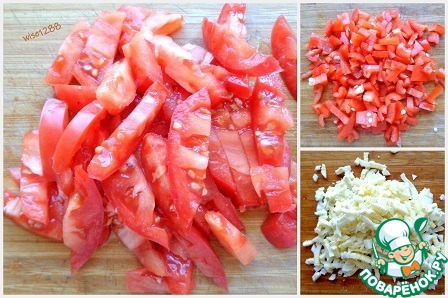 Помидор, перец, яйцо порезать соломкой.