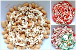 Салат сформировать слоями, слои чередовать сеточкой из майонеза. С фасоли слить жидкость и уложить в салатник первым слое. Второй слой помидор, третий слой крабовые палочки.