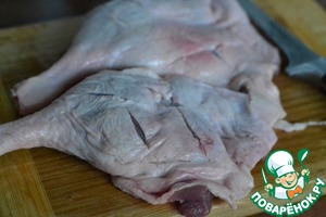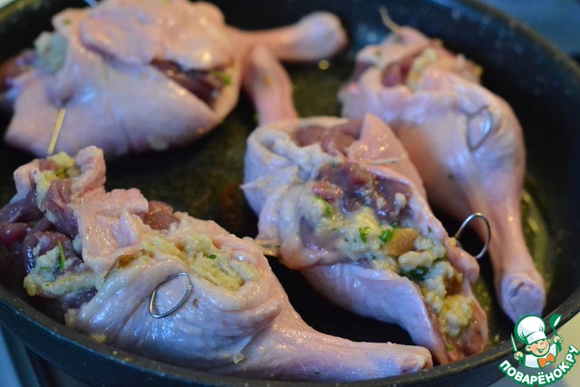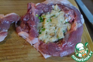 Наполнить утиный "кармашек" начинкой. Можно скрепить бока кожи зубочисткой.