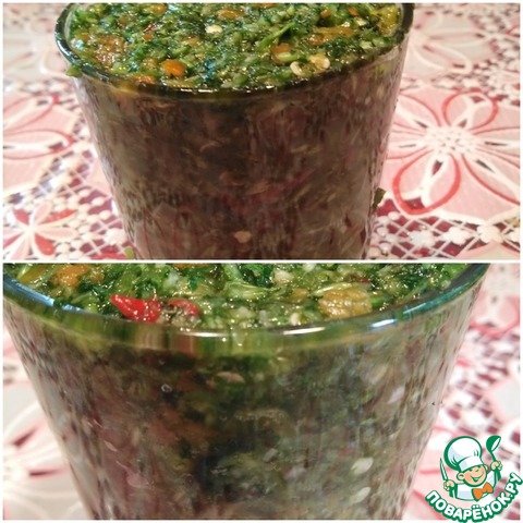 Все овощи и зелень пропустить через мясорубку добавить полстакана соли перемешать, дать настояться 3-4 дня, можно есть