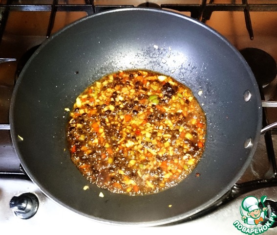 В воке (просто удобнее перемешивать, а можно и в простой сковороде) разогреваем масло и обжариваем чеснок, имбирь и ферментированные бобы.