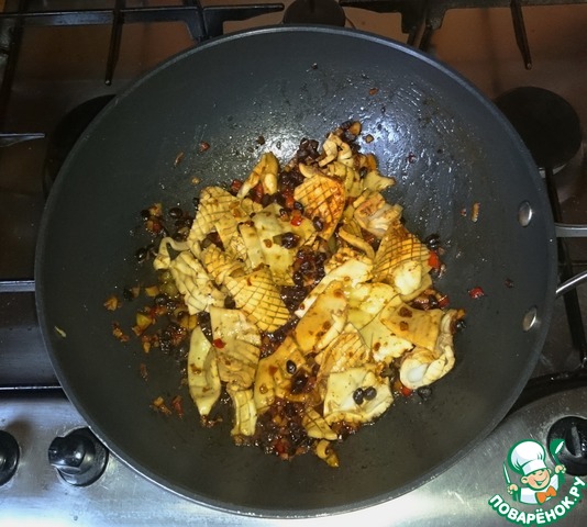 Прогреваем и добавляем кальмаров. Тушим минуты две-три, постоянно помешивая.