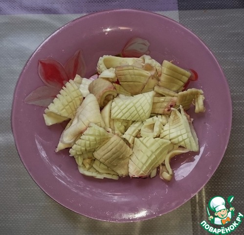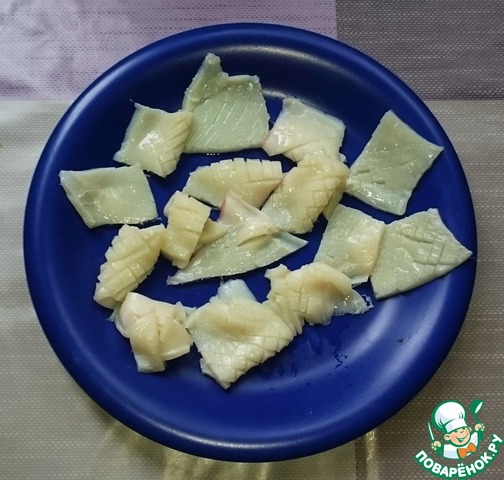 Потом нарезаем кальмаров на кусочки примерно 4х4 см.