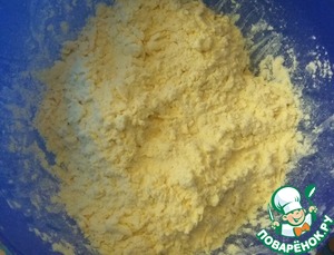 В половину муки добавить натертое на крупной терке холодное масло (можно в морозилке подморозить).