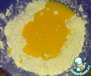 К масляной крошке добавить жидкую смесь, хорошо перемешать.