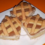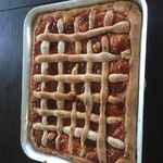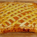 Меньшую часть теста раскатать и нарезать на полоски. Выложить полоски из теста сверху на яблочную начинку.