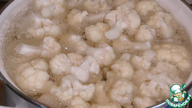 1 литр воды солим по вкусу и доводим до кипения. В кипящую воду отправляем капусту и после закипания варим 3-5- минут. Откидываем капусту на сито и даем стечь воде. -