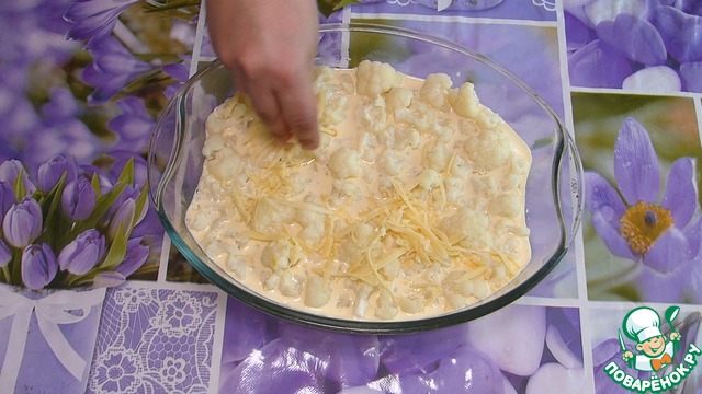 Форму для выпекания смазываем растительным масло. Выкладываем капусту цветную, поливаем заливкой и посыпаем тертым сыром.