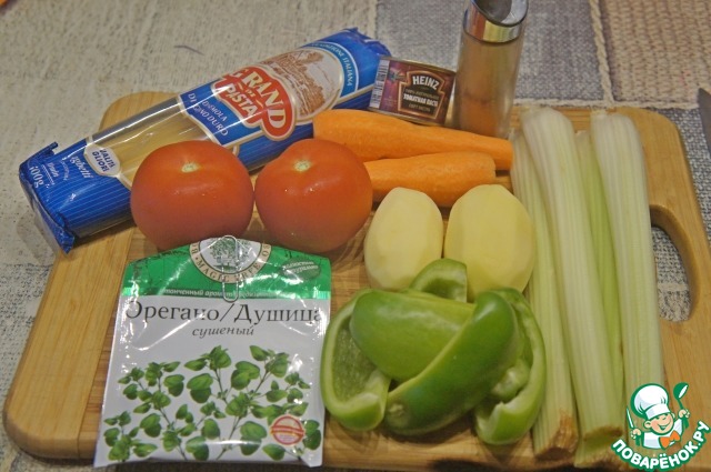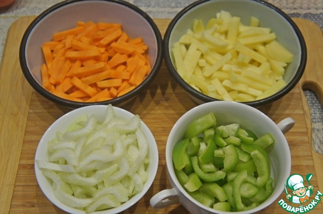 Сладкий перец, картофель и морковь, нарезать примерно одинаковыми средними кусочками. Тонко нарезать сельдерей.
