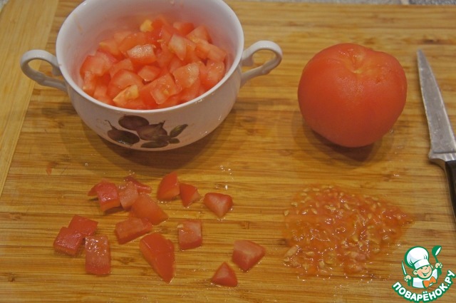 Помидоры ошпарить, затем обдать холодной водой и снять кожицу, мякоть порубить.