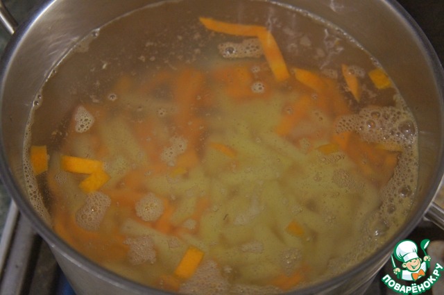 Сложить картофель и морковь в кастрюлю, залить 2 л питьевой воды, довести до кипения, варить 10 мин.
