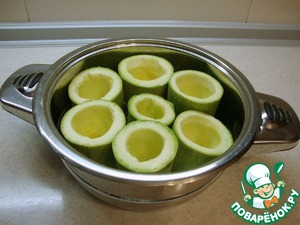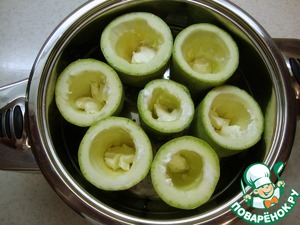 Кабачки вымыть, разрезать каждый примерно на 3-4 части. Удалить середину кабачка. Он должен быть в форме бочонка.
