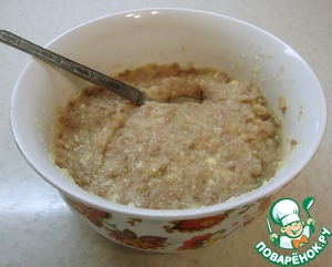 В фарш добавить измельченный лук с кабачками, крупу и соль.