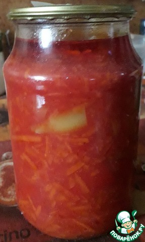 Сок, зелень (укроп, веточка сельдерея), сахар, соль, масло варить 30 минут (кипятить), убрать веточки зелени, затем добавить морковь и варить еще 20 минут. После добавить уксус, + любимые специи, и варить 10 минут, последним добавить перец, варить еще 5 минут и закатать.