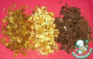 Орехи и шоколад порубить ножом, изюм запарить на 20 минут в горячей воде, затем промокнуть бумажным полотенцем от лишней влаги.