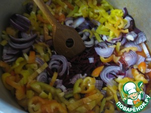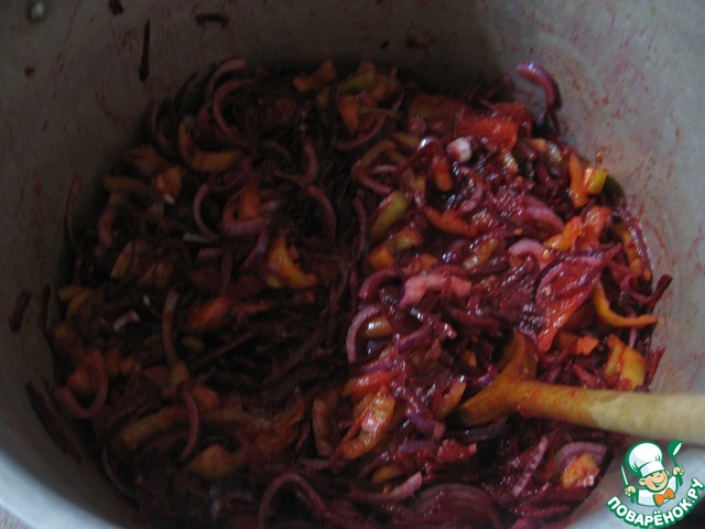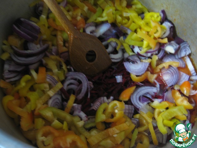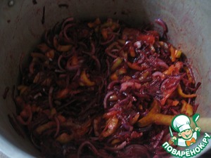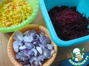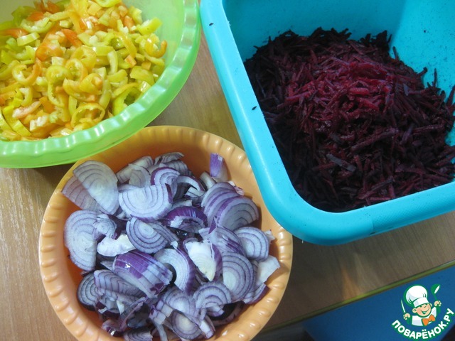 Помыть, почистить и нарезать соломкой лук и перец, свеклу натереть на терке, - я делала двойную норму.