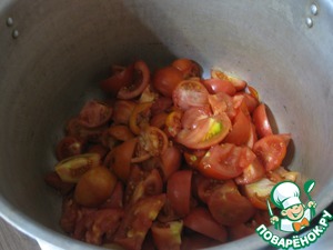 В кастрюлю наливаем масло, выкладываем помидоры и тушим их минут 15, если у вас прокрученные помидоры, то сразу в помидорный соус закладывайте все овощи. -