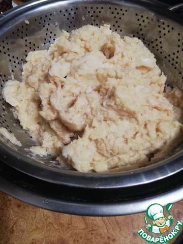 Итак натертый картофель выкладываем в дуршлаг и помещаем наш дуршлаг на миску, чтобы стек картофельный сок.