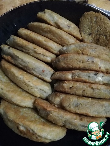 Как только обжарится первая партия, снимаем её и обжариваем вторую партию. Всего у меня получились 16 колдунов. Обжаренные колдуны выкладываем ребром в глубокую сковороду.
