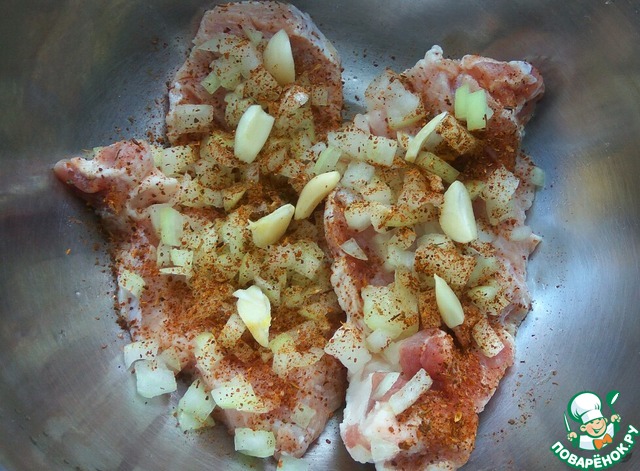 Лук с чесноком я выкладываю на готовое мясо и подаю к столу.