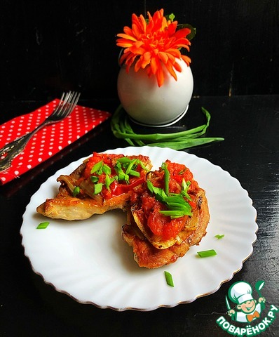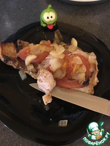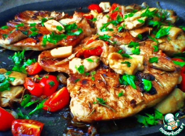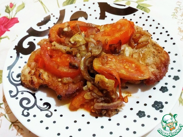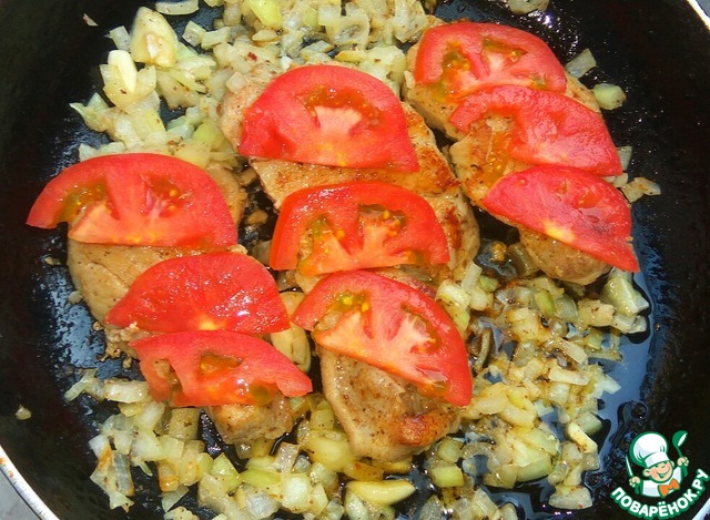 К мясу добавить чеснок и лук из маринада. На мясо положить нарезанный помидор. Накрыть крышкой, жарить еще 5 минут.