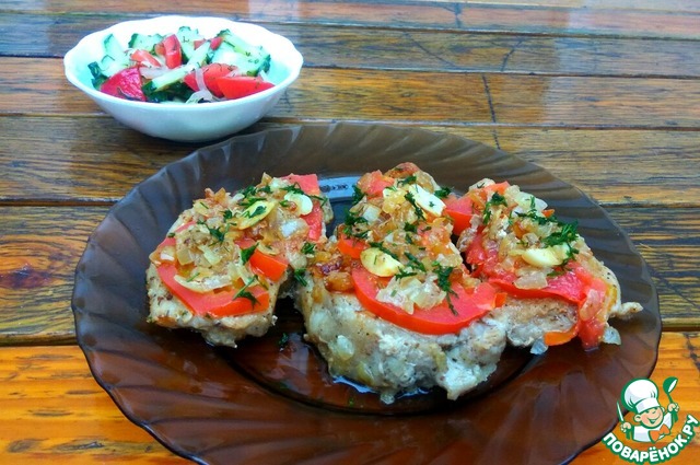 Сверху на стейки выкладываем нарезанный репчатый лук.