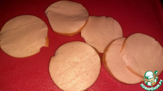 Колбасу нарезать тоненькими ломтиками.