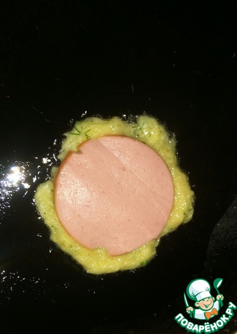 На раскаленное растительное масло выложить 0.5 ст л теста, быстро сформировать ложкой тоненький круг и сверху выложить колбасу, немного вдавливая её в тесто.