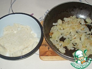 У хлеба срезать корки и замочить в молоке. Луковицу крупно нарезать и обжарить до золотистого цвета.
