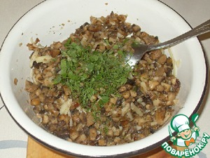 Начинку выложить в миску, остудить. Немного сыра натереть на крупной терке, примерно 2 ст. л., и добавить в начинку. Добавить мелко нарезанной зелени. Перемешать.