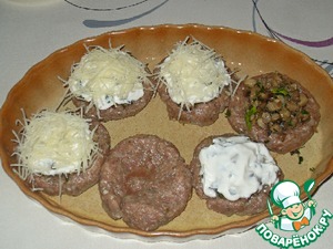 Обжаренные биточки выложить в форму для запекания. В углубления положить начинку, смазать майонезом или сметаной, посыпать сыром и поставить в горячую духовку.
