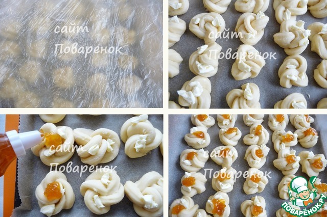 На заготовки выложить сливочное масло по краям, джем в центр.