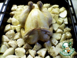Через 45 минут выложим картофель к курочке и запечём ещё 20 минут.
