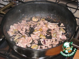Замороженные морепродукты выложить на разогретую сковороду с растительным маслом, обжарить в течение 10 минут. -