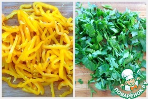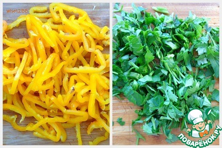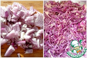 Для приготовления салата лук и капусту мелко порезать. Капусту посолить и немного помять.