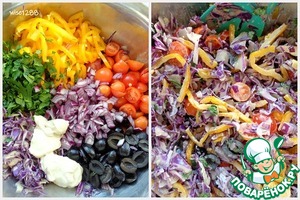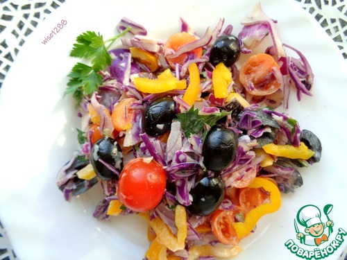 Овощной салат на основе краснокочанной капусты с контрастными по цвету сочными овощами и маслинами – краски осени в одной тарелке.
