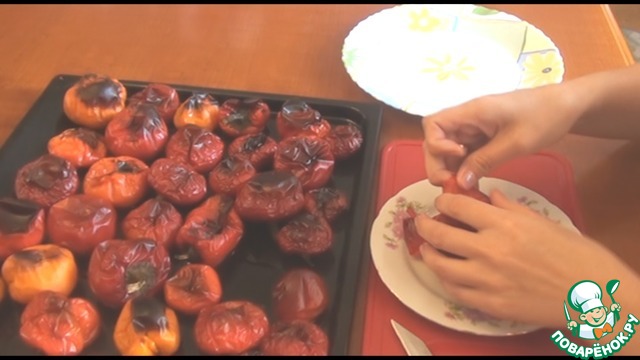 Перцы помыть и запечь в духовке при 200 градусах до готовности, примерно 20-25 минут, я обычно переворачиваю их ещё на другую сторону, чтобы равномерно пропеклись. Оставляю в духовке минут на 20, и потом достаю и чищу.