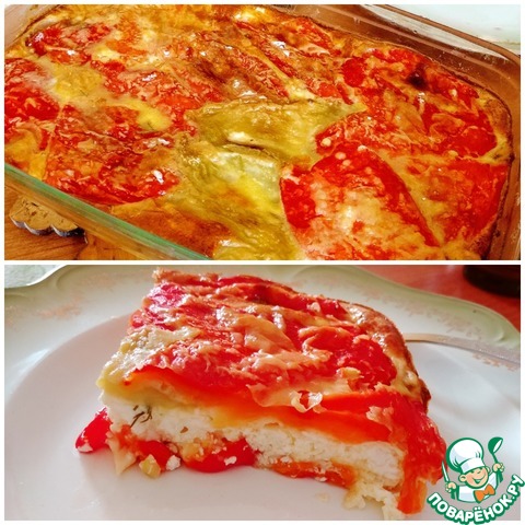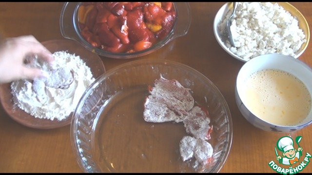 Сверху выкладываем слой брынзы или творога, потом опять обваливаем перец в муке, формируя верхний слой. Заливаем молочно-яичной смесью. Запекаем при температуре 200 градусов 30 минут.
