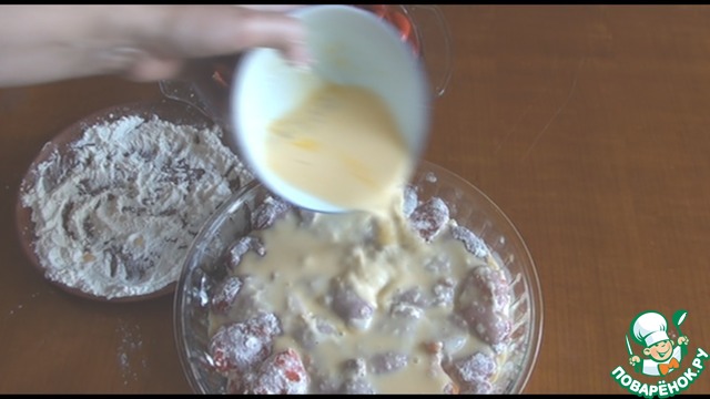 Форму для запекания смазать подсолнечным маслом, берем очищенный перец, обваливаем в муке и выкладываем в форму. И так делаем с каждым куском перца, формируя слой теста.