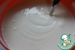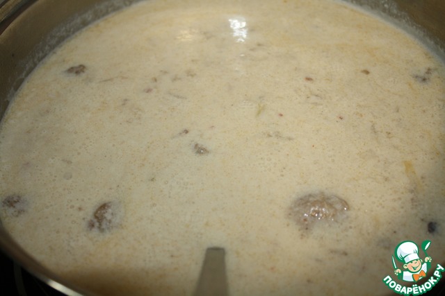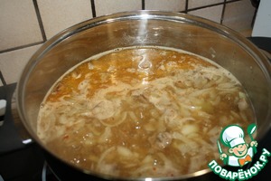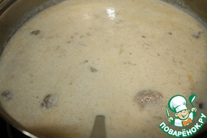 При интенсивном помешивании влить смесь к мясу и после закипания варить около 4 минут.