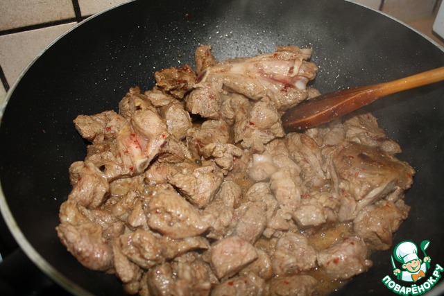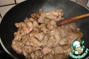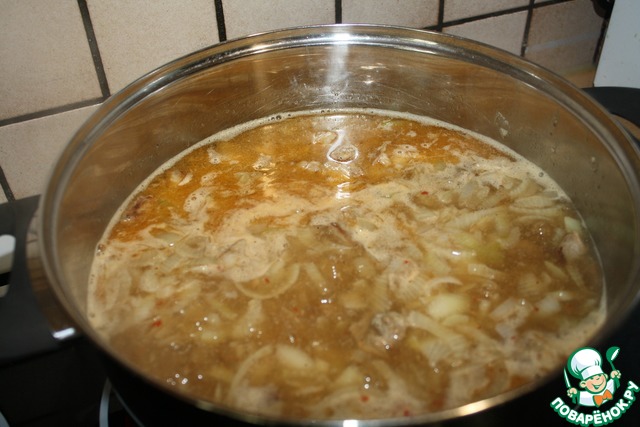Затем переложить в кастрюлю и долить горячей воды, чтобы на два пальца была выше мяса, варить до мягкости мяса.