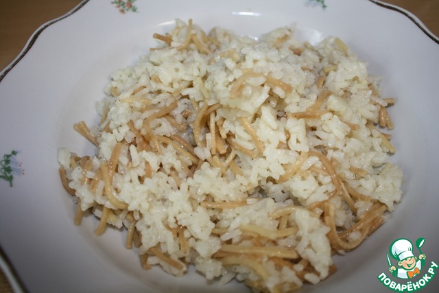 Обжарить вермишель до золотистого цвета, постоянно мешая, затем добавить рис и еще поджариваем около 5 минут, затем вливаем три стакана кипящей воды. Закрываем крышкой, убавляем огонь до минимума и томим до готовности. -