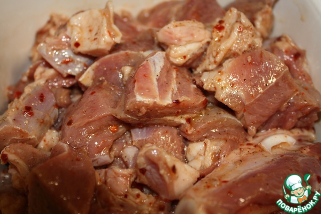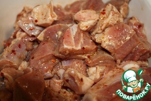 Нарезать мясо на небольшие кусочки, сбрызнуть соком лимона и маслом растительным, поперчить черным и красным перцем, посыпать сухим чесноком. Оставить промариноваться на пару часов или на ночь. -