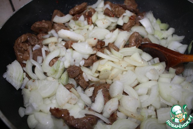 Нарезать лук полукольцами и добавить к мясу. Обжаривать до мягкости лука.