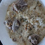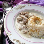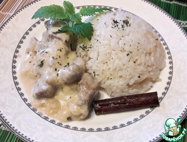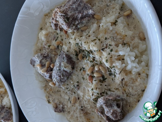 Блюдо собираем так: на дно тарелки выкладывается рис, затем поливают щедро подливой с мясом.