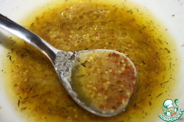 Смешать оливковое масло, лимонный сок, горчицу, сухой тимьян и мелко нарезаный зеленый лук.