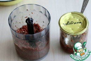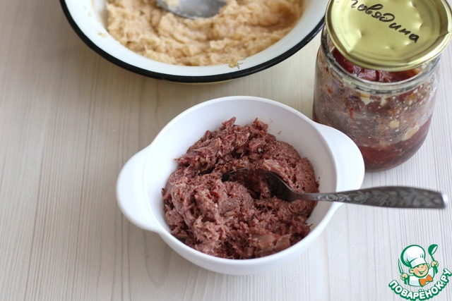 Домашнюю тушенку (1/2 банки) пробить в блендере или размять вилочкой.