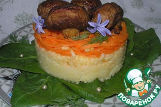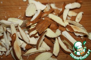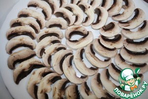 Нарезать тонко шампиньоны и разложить в один слой на блюдо.