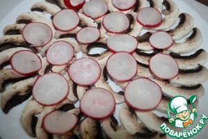 Тонко нарезать редис и выложить поверх шампиньонов.